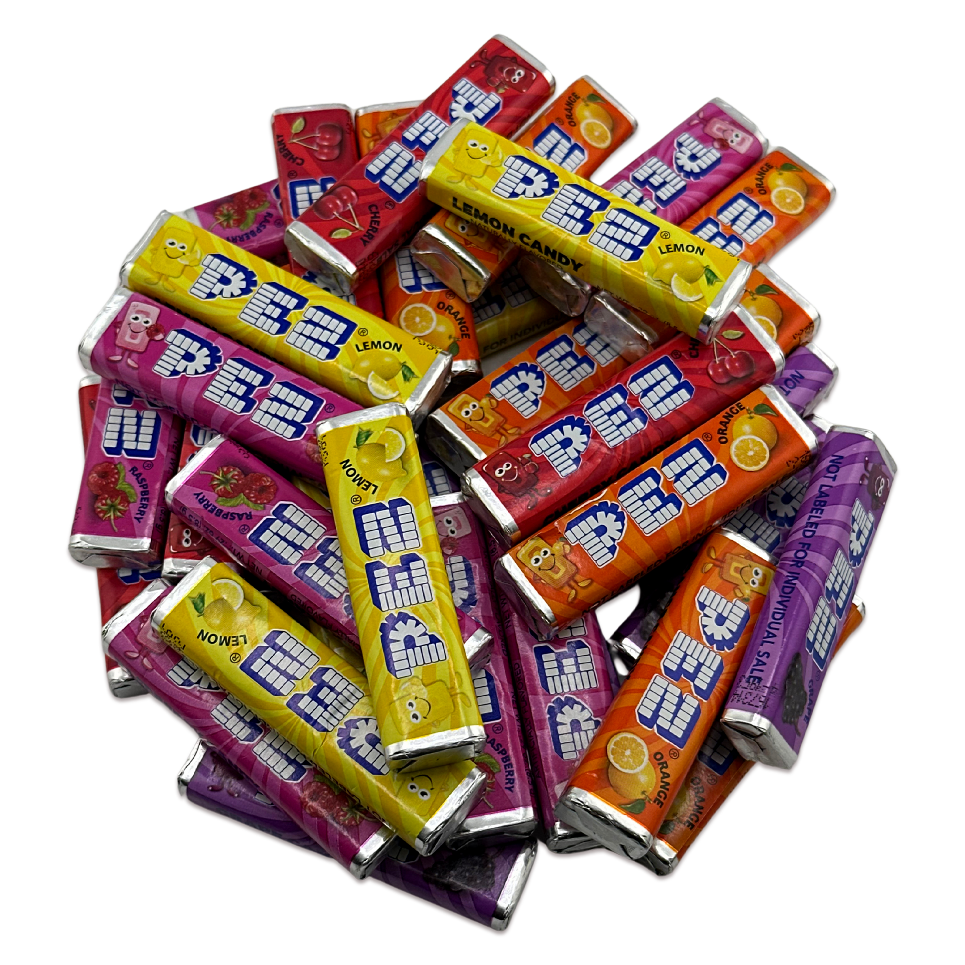 2LB Bag of assorted Pez candy refill rolls. Flavors include: Cherry, Strawberry, Raspberry, Orange, Lemon, and Grape. Continue the life of your pez dispensers by feeding them new bulk pez candy refill rolls. Pez candy refills are compact enough they can be stored pretty much anywhere and everywhere so you will always have a roll ready when hunger strikes. These pez refill rolls also work great for candy buffets, party favors, sharing with friends and coworkers, or to keep a roll handy in several different places around the house, cars, desks, backpacks, and lunchboxes.