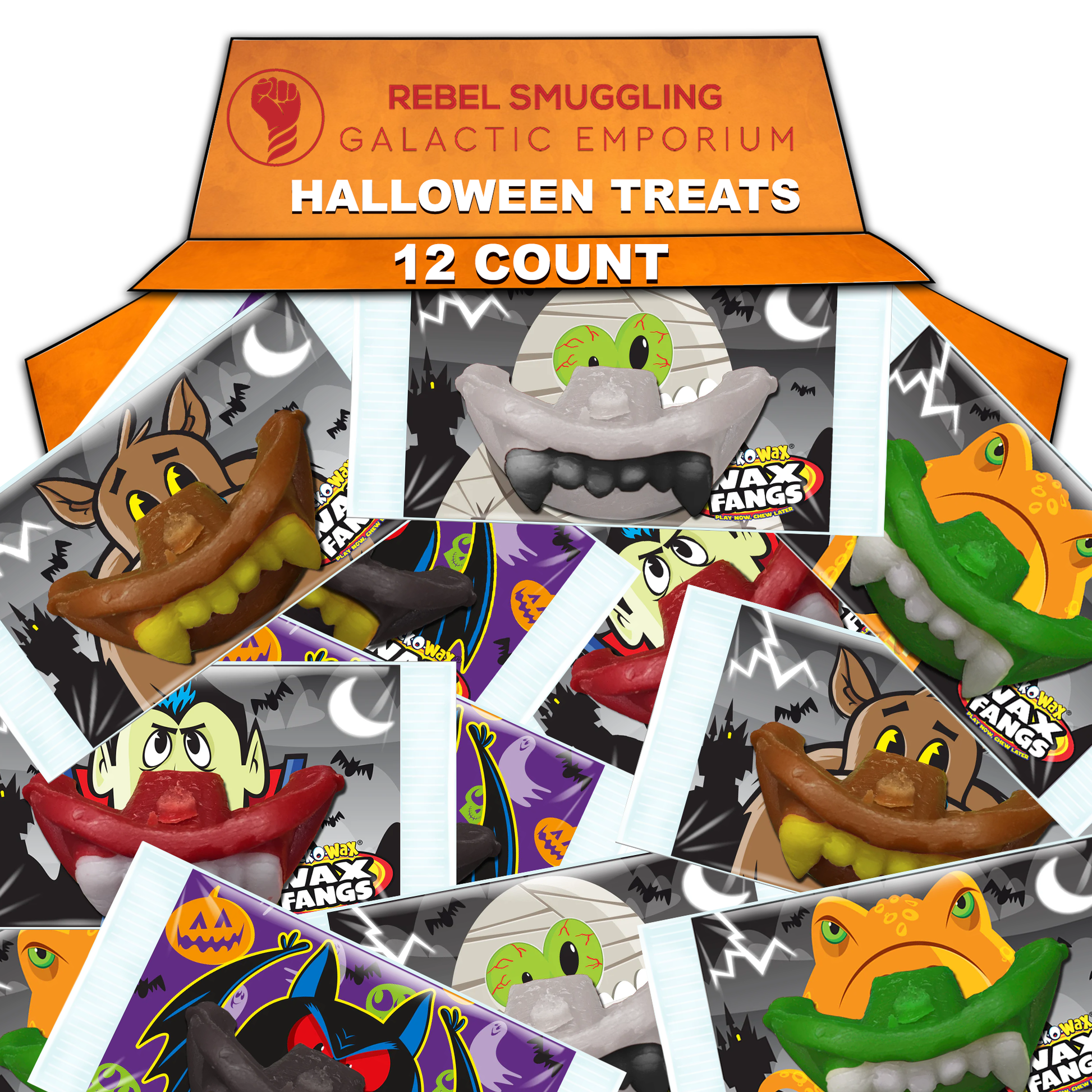 Halloween Spooky Wax Fangs Bulk 12 Pack Variety of Monster, Mummy, Vampire, Bat by Rebel Smuggling Galactic Emporium